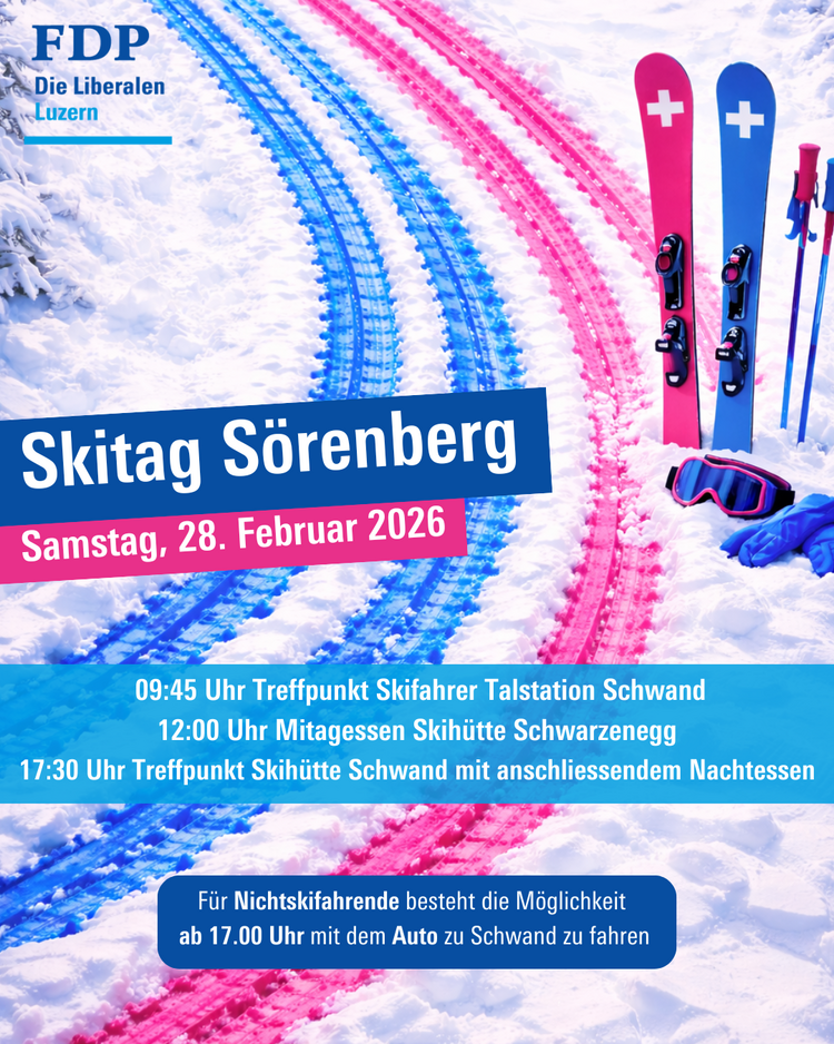 Alle liberalen Skibegeisterte treffen sich zum Skifahren und anschliessendem Abendessen im Sörenberg. Alle Nichtskifahrende sind am gemeinsamen Abendessen in der Schwand herzlich willkommen.